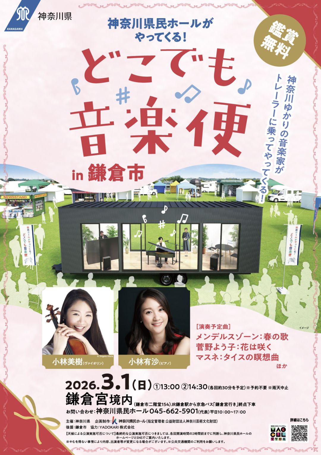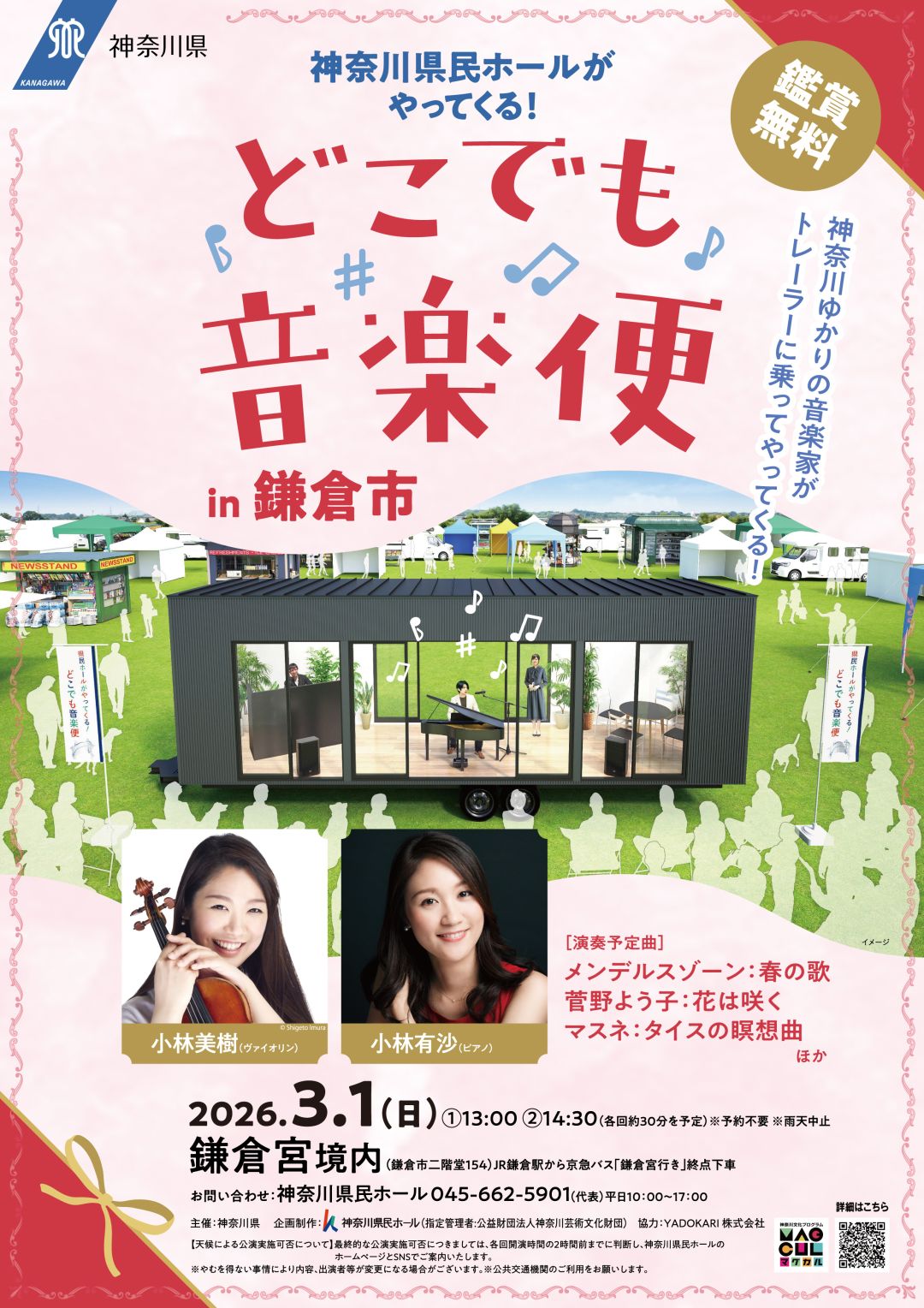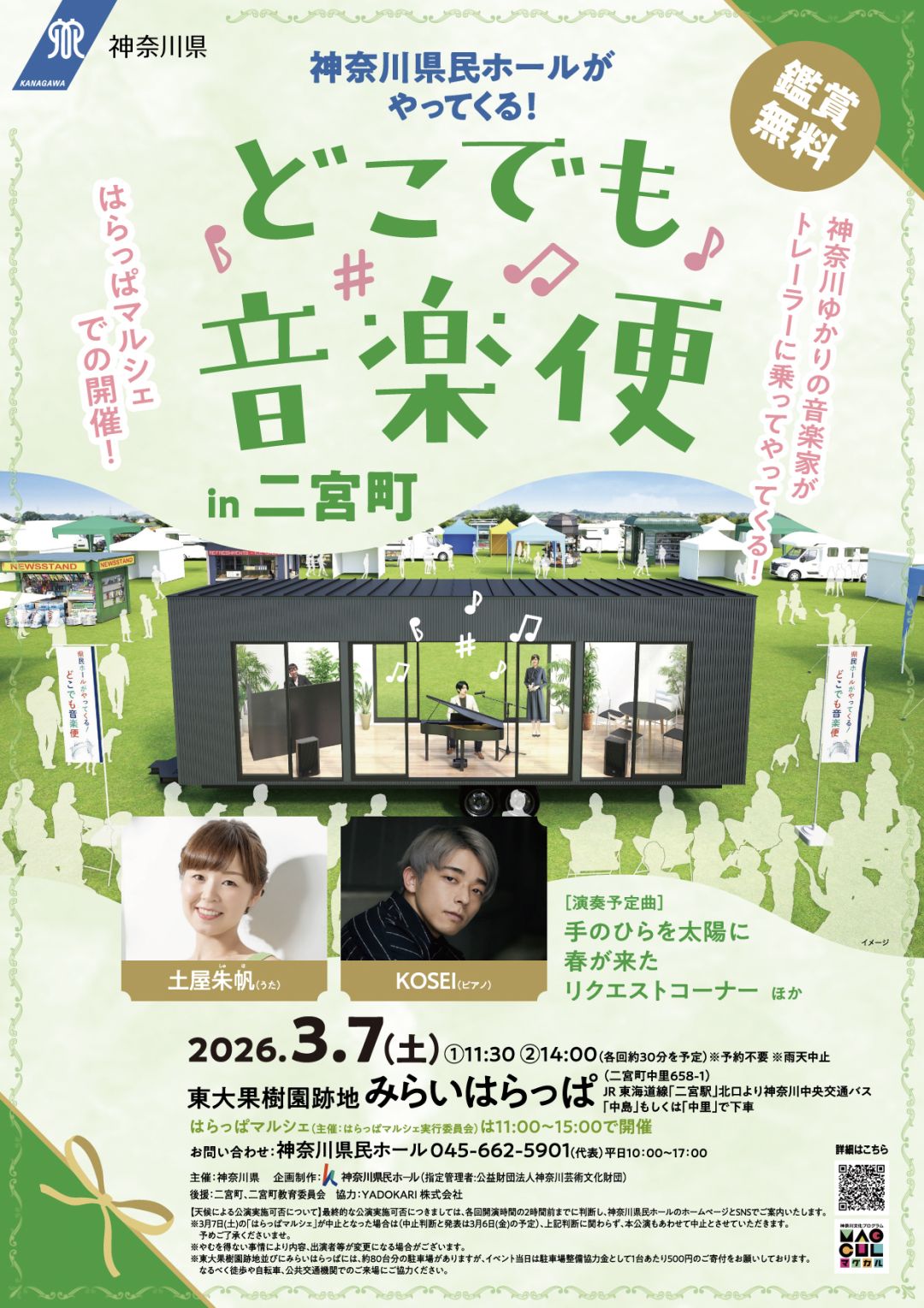 神奈川ゆかりの音楽家がトレーラーに乗ってやってくる。神社、はらっぱ、港で生演奏。