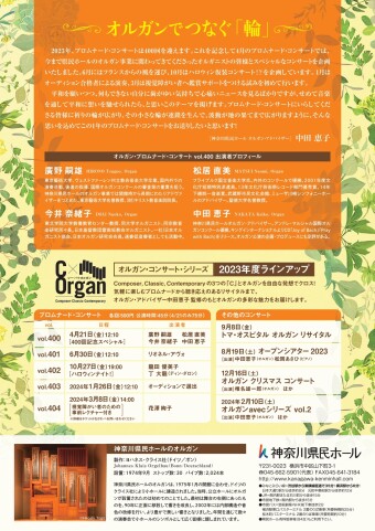 - Vol.404 2024年3月8日(金)14:00(視覚障がい者のための事前レクチャー付き) オルガン:花澤 絢子