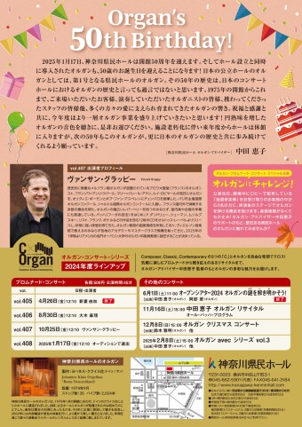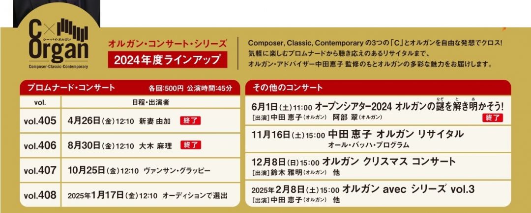 Composer, Classic, Contemporaryの3つの「C」とオルガンを自由な発想でクロス!気軽に楽しむプロムナードから聴き応えのあるリサイタルまで、オルガン・アドバイザー中田恵子の監修のもとオルガンの多彩な魅力をお届けします。
