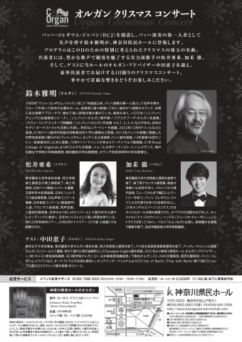 共演者には、豊かな歌声で観客を魅了する実力派歌手の松井亜希、加耒 徹、そして、ゲストに当ホールのオルガン・アドバイザー中田恵子を迎え、