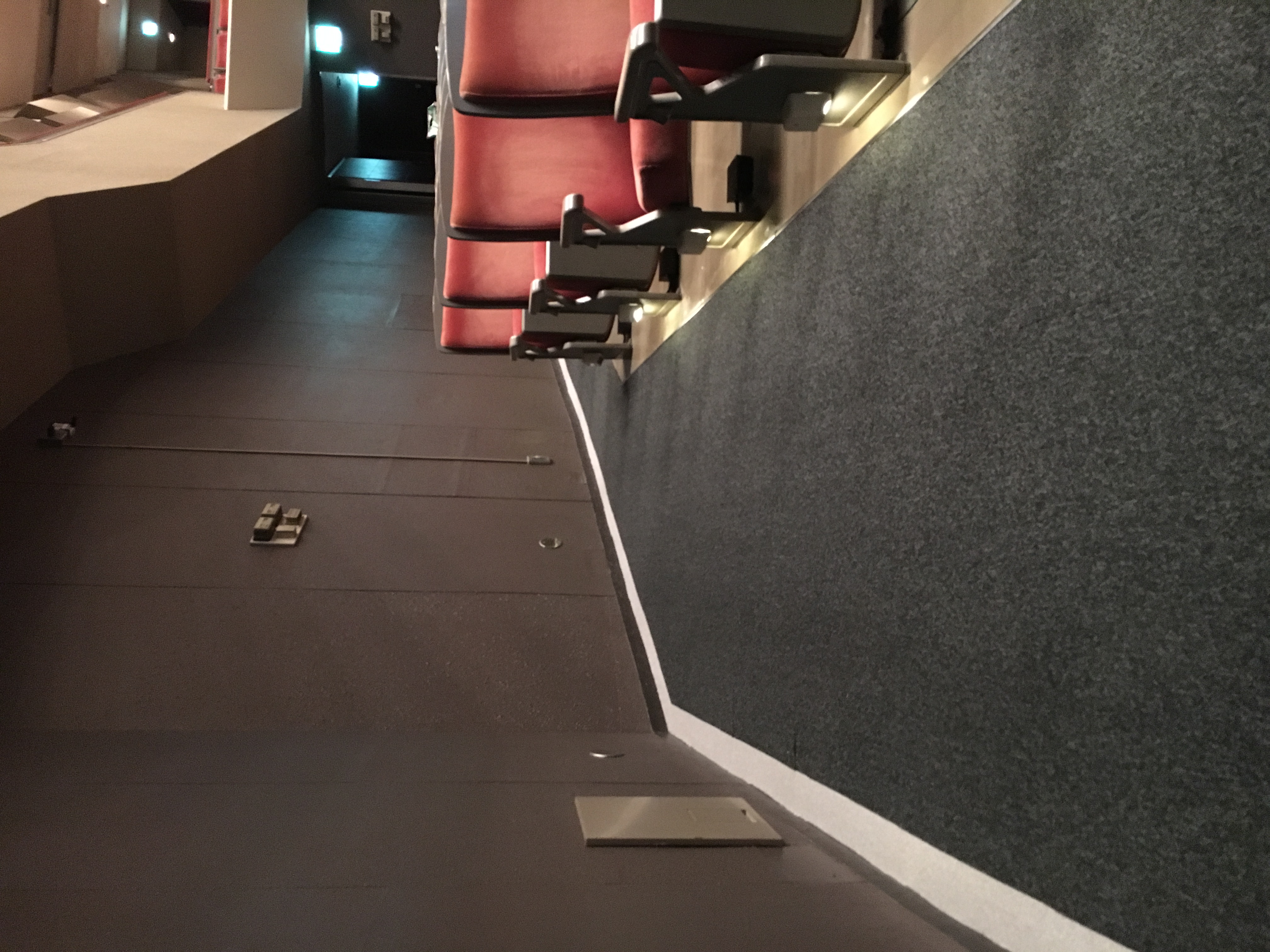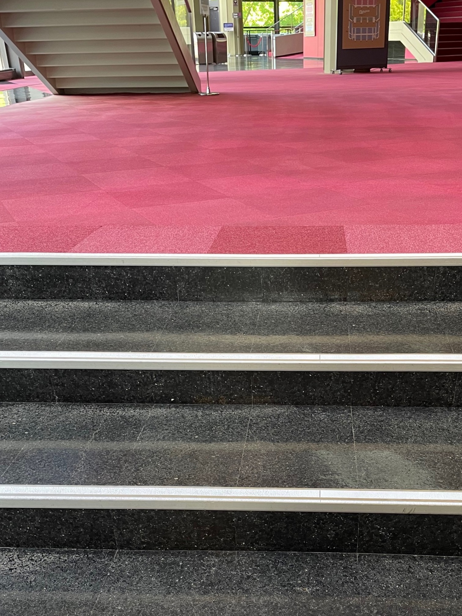 立体感が分からなくて最も困る場所といえば、そう、階段です。視力低下は眼鏡で補えますが、明暗差の場合は個人で補う方法はなく、対象物に手を加えるしかありません。そこで大ホールロビー階段の各段のヘリを、思い切り白く塗りました。次の段までの距離や高さを瞬時に把握できるようにして、転倒のリスクを軽減させるのが目的です。デザインとか雰囲気とかは後回しにして、視認性最優先の安全な階段を目指し、ブラッシュアップを続けます。