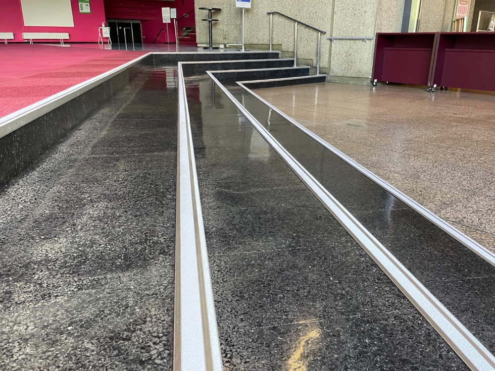 昨夏の大ホールロビーの階段に続き、小ホールロビーの階段も視認性を向上させてみました。大ホールとの違いは、コントラストの付け方です。