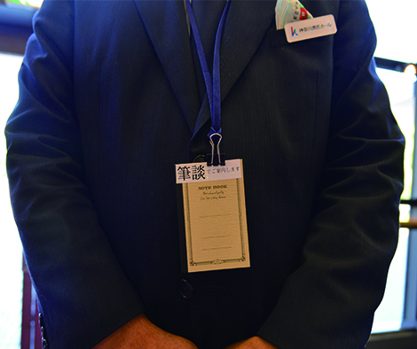 会場案内スタッフは、いつも携帯しているメモ帳に「筆談でご案内します」と目立つようにシールを貼り、受付カウンターの筆談器、指差し用の館内マップといった案内をプラスしました。 おそらく、覚えたての手話はたどたどしいものだったと思いますが、お客様は笑顔と手話で返してくださいました。