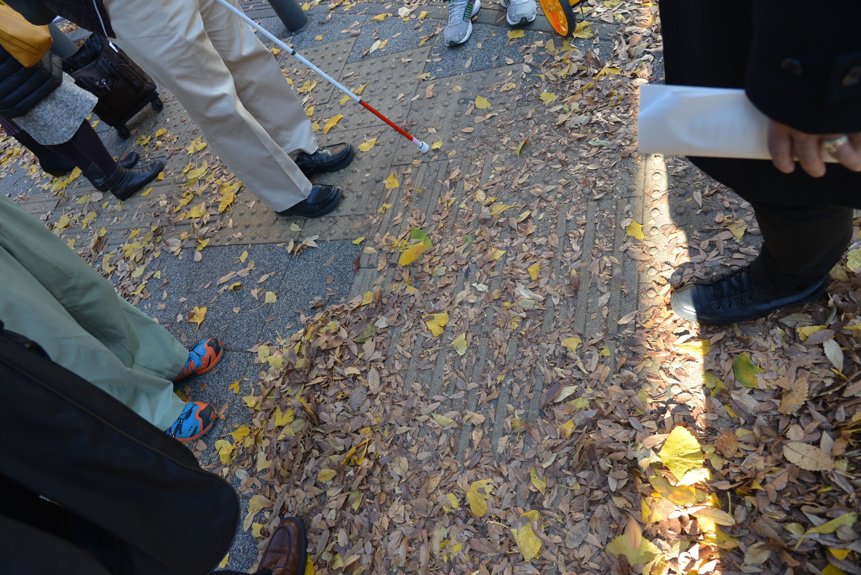 先日、第2回目の調査が行われました。1回目は、ルートを開拓しながら、空間をことばに変えていきます。 そして2回目は、その原稿を片手に、1回目と違うメンバーが、空間が分かりやすく表現されているかを検証しながら同じ道をたどります。不要な情報を削り、危険を回避するための情報を加えながら丁寧に言語化していきます。今回、初めて気づいた歩道の隅の路面から数センチ飛び出した四角い石。これは、転倒の危険があるため、道案内に入れることになりました。「でっぱり」「突起物」・・どれがいいのか、他の道案内の例を挙げながら3人のスタッフが話し合います。そして「境界石」と決定。