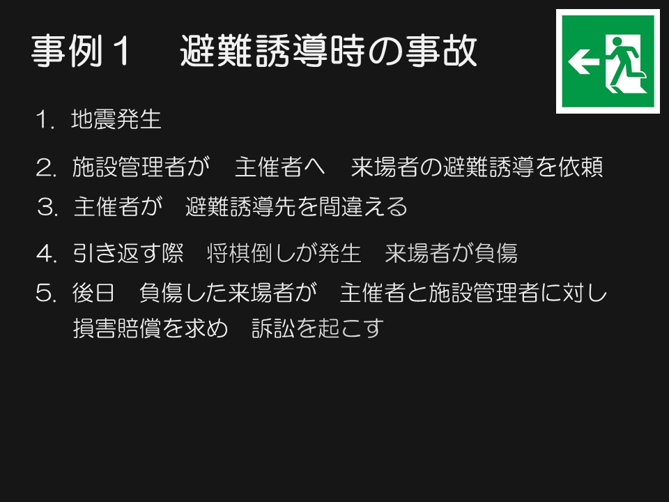 ①「避難誘導時、主催者が避難誘導先を間違えて、引き返す際に、来場者が大怪我をした」