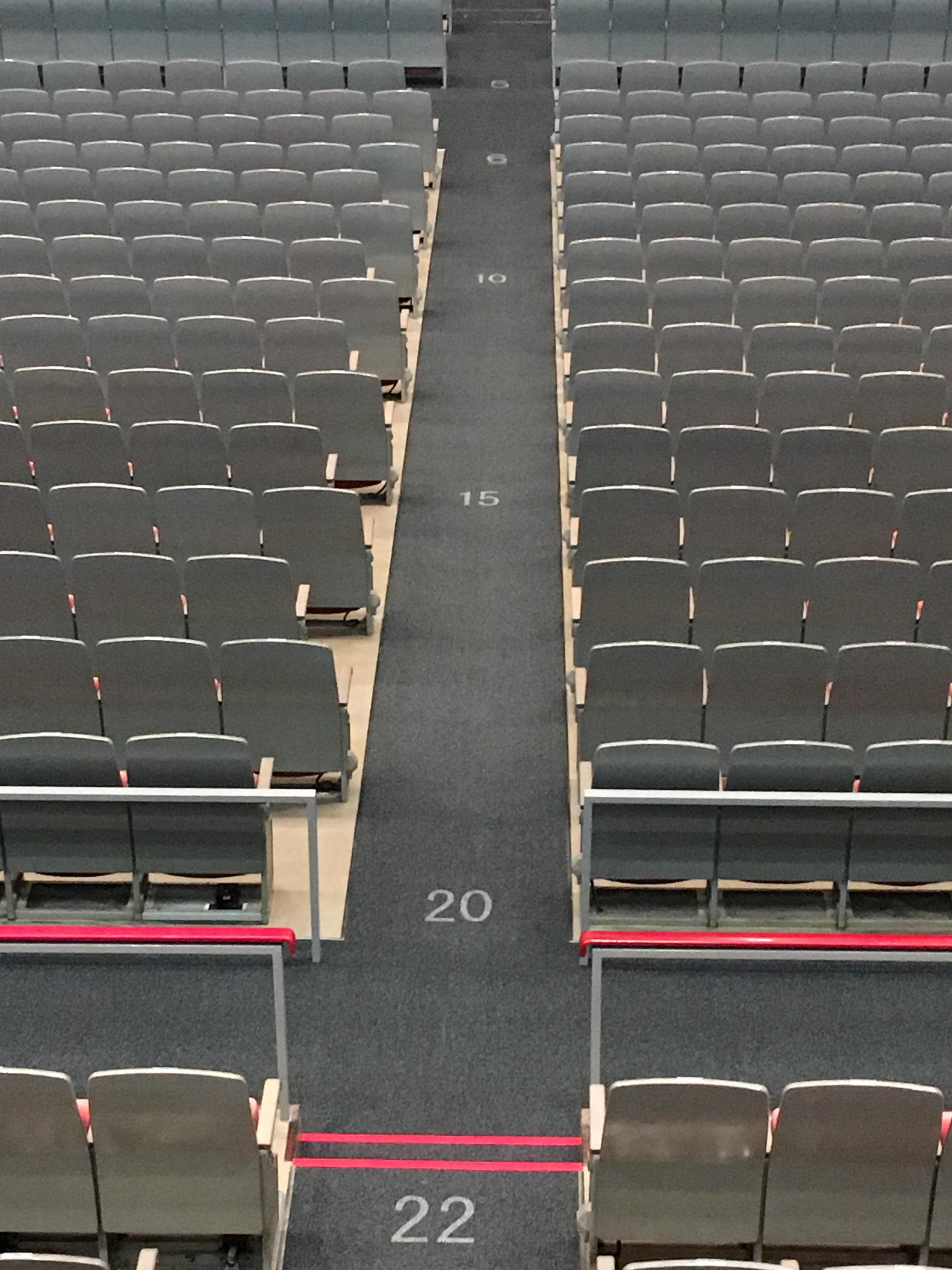 そんなストレスを軽減できないかと、1階席のカーペットに列番号を記してみました。