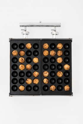 左から≪Animated Clock≫(2013) 、≪Sound Sphere≫(2011) 、≪Takoyaki Sequencer≫(2014) photo: Nobutada Omote