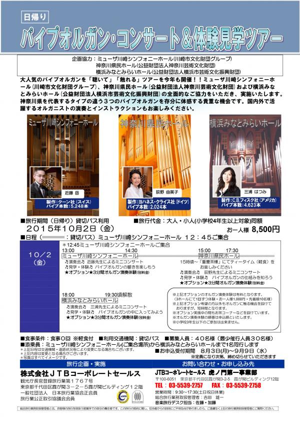 毎回大人気のパイプオルガンを「聴いて」「触れる」ツアーを今年も開催!ミューザ川崎シンフォニーホール(川崎市文化財団グループ)、神奈川県民ホール(公益財団法人神奈川芸術文化財団)、および横浜みなとみらいホール(公益財団法人横浜市芸術文化振興財団)の全面的なご協力をいただき実現しました。神奈川県を代表するタイプの違う3つのパイプオルガンを存分に体感する貴重な機会です。