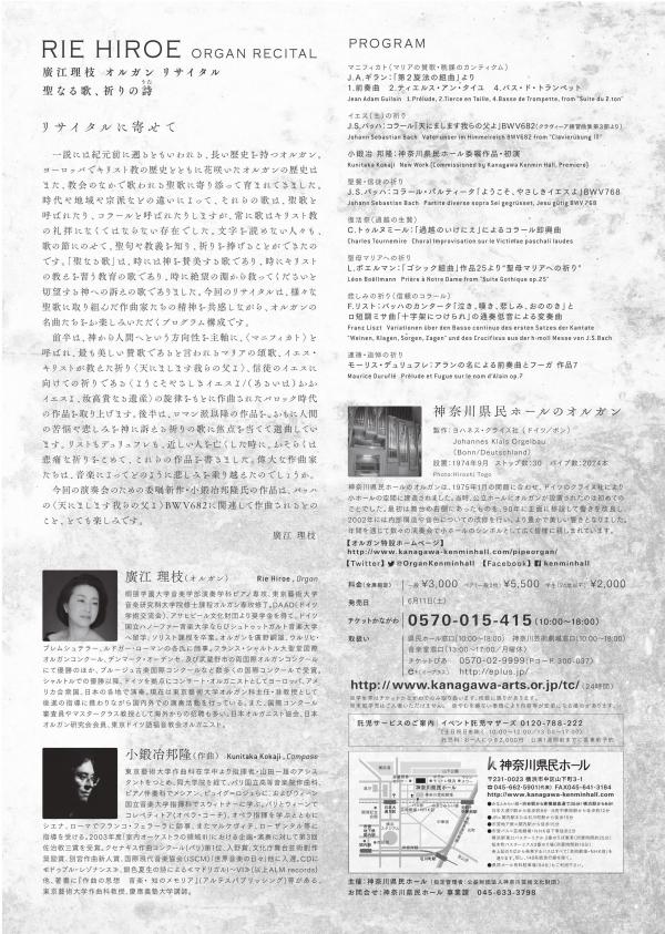 廣江 理枝(オルガン) Rie Hiroe, OrganJ.A.ギラン:「第2旋法の組曲」より 1.前奏曲 2.ティエルス・アン・タイユ 4.バス・ド・トランぺット J.S.バッハ:コラール「天にまします我らの父よ」BWV682(クラヴィーア練習曲集第3部より) 小鍛冶邦隆:神奈川県民ホール委嘱作品・初演 J.S.バッハ:コラール・パルティータ「ようこそ、やさしきイエスよ」BWV768 C.トゥルヌミール:「過越のいけにえ」によるコラール即興曲 L.ボエルマン:「ゴシック組曲」作品25 より “聖母マリアへの祈り” F.リスト:バッハのカンタータ「泣き、嘆き、悲しみ、おののき」とロ短調ミサ曲「十字架につけられ」の通奏低音による変奏曲 M.デュリュフレ :アランの名による前奏曲とフーガ 作品7廣江 理枝(オルガン) Rie Hiroe,Organ 桐朋学園大学音楽学部演奏学科ピアノ専攻、東京藝術大学音楽研究科大学院修士課程オルガン専攻修了。DAAD(ドイツ学術交流会)、アサヒビール文化財団より奨学金を得て、ドイツ国立ハノーファー音楽大学ならびシュトゥットガルト音楽大学へ留学、ソリスト課程を卒業。オルガンを廣野嗣雄、ウルリヒ・ブレムシュテラー、ルドガー・ローマンの各氏に師事。フランス・シャルトル大聖堂国際オルガンコンクール優勝、デンマーク・オーデンセ国際オルガンコンクール優勝、及び武蔵野市国際オルガンコンクール最高位受賞のほか、ブルージュ古楽国際コンクールなど数多くの国際コンクールで入賞。シャルトルでの優勝以降、ドイツを拠点にコンサート・オルガニストとしてヨーロッパ、アメリカ合衆国、日本の各地で演奏。現在は東京藝術大学オルガン科主任・准教授として後進の指導に携わりながら国内外での演奏活動を行っている。また、国際コンクール審査員(2012年武蔵野市国際オルガンコンクール、13年、16年ニュルンベルク国際オルガンコンクール、15年カリーニングラード・タリヴェルディエフ・オルガンコンクール)やマスタークラス教授として海外からの招聘も多い。日本オルガニスト協会、日本オルガン研究会会員、東京ドイツ語福音教会オルガニスト。チケット