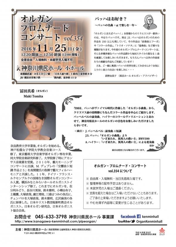 冨田 真希(オルガン) Maki Tomita, OrganJ.S.バッハ:「オルガン小曲集」より いざ来たれ、異教徒の救い主よ BWV599 神よ、その慈悲により(神の御子は来たれり) BWV600 神のひとり子なる主キリスト BWV601 ほか奈良教育大学卒業後、オルガンを始める。神戸松蔭女子学院大学教会音楽コース修了、東京藝術大学音楽学部オルガン専攻卒業、同大学院音楽研究科修了。大学院修了時にアカンサス音楽賞を受賞。2010年、藝大モーニングコンサートに出演、M.デュプレの「交響曲ト短調 作品25」を高関健氏の指揮で藝大フィルハーモニアと共演した。11年、ドイツ・フランス・ルクセンブルクの国境なき国際オルガンコンクール入賞。横浜みなとみらいホールオルガニストインターンシップ修了。 これまでにオルガンを、佐分利みどり、長谷川美保、鈴木雅明、小榑由布子、土橋薫、大塚直哉、廣江理枝、三浦はつみの各氏に、チェンバロを大塚直哉、鈴木雅明、広沢麻美の各氏に師事した。日本キリスト教団桜新町教会オルガニスト。日本オルガン研究会、日本オルガニスト協会会員。チケット