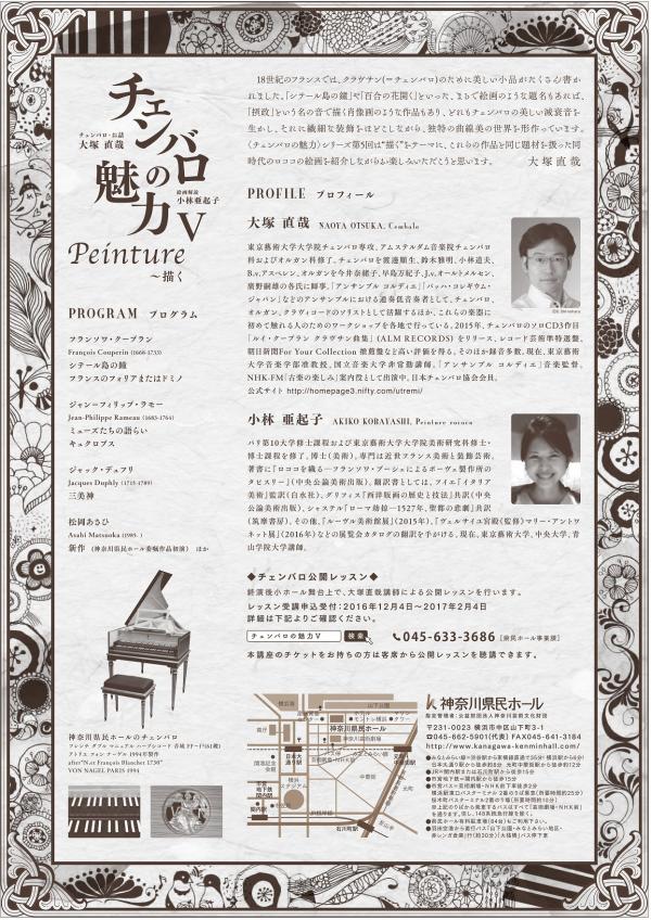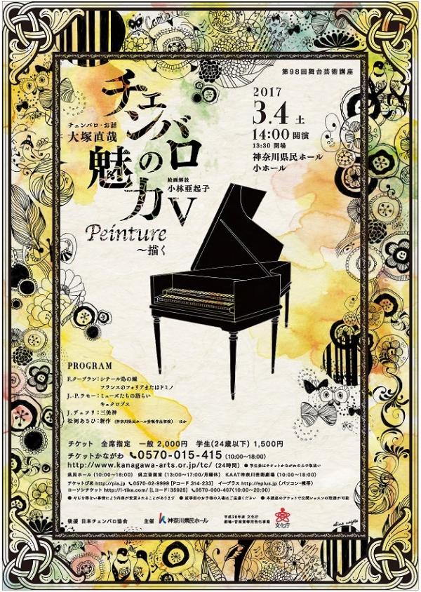 チェンバロ・お話:大塚直哉 Naoya Otsuka, Cembalo 絵画解説:小林亜起子 Akiko Kobayashi, Peinture rococoフランソワ・クープラン François Couperin (1668-1733) シテール島の鐘 フランスのフォリアまたはドミノ ジャン=フィリップ・ラモー Jean-Philippe Rameau(1683-1764) ミューズたちの語らい キュクロプス ジャック・デュフリ Jacques Duphly (1715-1789) 三美神 松岡あさひ Asahi Matsuoka(1985- ) 新作(神奈川県民ホール委嘱作品初演) ほか大塚 直哉 Naoya Otsuka, Cembalo 東京藝術大学大学院チェンバロ専攻、アムステルダム音楽院チェンバロ科およびオルガン科修了。チェンバロを渡邊順生、鈴木雅明、小林道夫、B.v.アスペレン、オルガンを今井奈緒子、早島万紀子、J.v.オールトメルセン、廣野嗣雄の各氏に師事。「アンサンブル コルディエ」「バッハ・コレギウム・ジャパン」などのアンサンブルにおける通奏低音奏者として、チェンバロ、オルガン、クラヴィコードのソリストとして活躍するほか、これらの楽器に初めて触れる人のためのワークショップを各地で行っている。2015年、チェンバロのソロCD三作目「ルイ・クープラン クラヴサン曲集」 (ALM RECORDS) をリリース、レコード芸術準特選盤、朝日新聞For Your Collection 推薦盤など高い評価を得る。そのほか録音多数。現在、東京藝術大学音楽学部准教授、国立音楽大学非常勤講師。「アンサンブル コルディエ」音楽監督。NHK-FM「古楽の楽しみ」案内役として出演中。日本チェンバロ協会会員。公式サイトhttp://homepage3.nifty.com/utremi/ 小林 亜起子 絵画解説 Akiko Kobayashi Peinture rococo パリ第10大学修士課程および東京藝術大学大学院美術研究科修士・博士課程を修了。博士(美術)。専門は近世フランス美術と装飾芸術。著書に『ロココを織る―フランソワ・ブーシェによるボーヴェ製作所のタピスリー』(中央公論美術出版)。翻訳書としては、フイエ『イタリア美術』監訳(白水社)、グリフィス『西洋版画の歴史と技法』共訳(中央公論美術出版)、シャステル『ローマ劫掠―1527年、聖都の悲劇』共訳(筑摩書房)。その他、『ルーヴル美術館展』(2015年)、『ヴェルサイユ美術館《監修》マリー・アントワネット展』(2016年)などの展覧会カタログの翻訳を手がける。現在、東京藝術大学、中央大学、青山学院大学講師。チケット