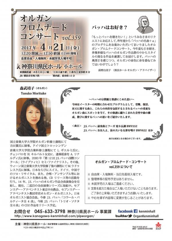 森武 靖子(オルガン) Yasuko Moritake, OrganJ.S.バッハ:おお人よ、汝の罪の大いなるを嘆け BWV622 J.S.バッハ:キリストは死の縄目につながれし BWV625 J.S.バッハ:いまぞ喜べ、愛するキリスト者の仲間たち BWV734 J.S.バッハ:前奏曲とフーガ 変ホ長調 BWV552 森武 靖子(オルガン) Yasuko Moritake, Organ 国立音楽大学大学院オルガン科修士課程にて吉田實氏に師事。ドイツ国立トロッシンゲン音楽大学大学院古楽科修士課程にてL.ギエルミ氏に、チェンバロをH.キルバルト女史に、通奏低音をA.リナルディ氏に師事。2000年「第12回J.S.バッハ国際コンクール」(ライプツィヒ)セミ・ファイナリスト。その後、ウィーン国立音楽大学大学院修了後の課程にてM.ラドゥレスク氏に師事。日本ならびにスイス、ドイツ、中国でのソロ・リサイタル、また、合唱・アンサンブル等におけるオルガニストを務める他、CDリリース等の活動を行う。2014年、J.S.バッハのオルガン作品全曲演奏会を完結し、現在、二巡目の全曲演奏シリーズに取組中。セブンスデー・アドベンチスト東京中央教会、セブンスデー・アドベンチスト教団草苅オルガン・オルガニスト。日本オルガニスト協会会員。今春、JS.バッハ「コラール・パルティータ全4曲」、今秋、J.S.バッハ「トリオ・ソナタ全6曲」のCD2作品をリリース予定。チケット