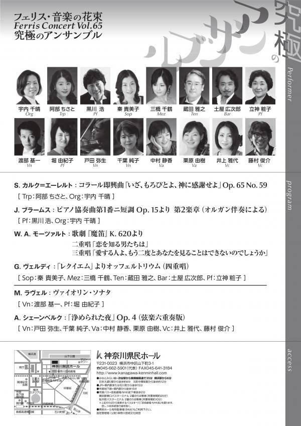 Vn. 戸田弥生、千葉純子、渡部基一 Va. 中村静香、栗原由樹 Vc. 藤村俊介、井上雅代 Trp. 阿部ちさと Sop. 秦 貴美子 Mez. 三橋千鶴 Ten. 蔵田雅之 Bar. 土屋広次郎 Org. 宇内千晴 Pf. 立神粧子、堀 由紀子、黒川 浩第1部 S. カルク=エーレルト:コラール即興曲 「いざ、もろびとよ、神に感謝せよ」Op. 65 No. 59 [Trp:阿部ちさと、Org:宇内千晴] J. ブラームス:ピアノ協奏曲第1番ニ短調 Op. 15より 第2楽章(オルガン伴奏による) [Pf:黒川 浩、Org:宇内千晴] W. A. モーツァルト:歌劇『魔笛』K. 620より 二重唱「恋を知る男たちは」 三重唱「愛する人よ、もう二度とあなたを見ることはできないのでしょうか」 G. ヴェルディ:「レクイエム」よりオッフェルトリウム(四重唱) [Sop:秦 貴美子、Mez:三橋千鶴、Ten:蔵田雅之、 Bar:土屋広次郎、Pf:立神粧子] 第2部 M. ラヴェル:ヴァイオリン・ソナタ [Vn:渡部基一、Pf:堀 由紀子] A. シェーンベルク:「浄められた夜」Op. 4(弦楽六重奏版) [Vn:戸田弥生、千葉純子、Va:中村静香、栗原由樹、 Vc:井上雅代、藤村俊介]チケット