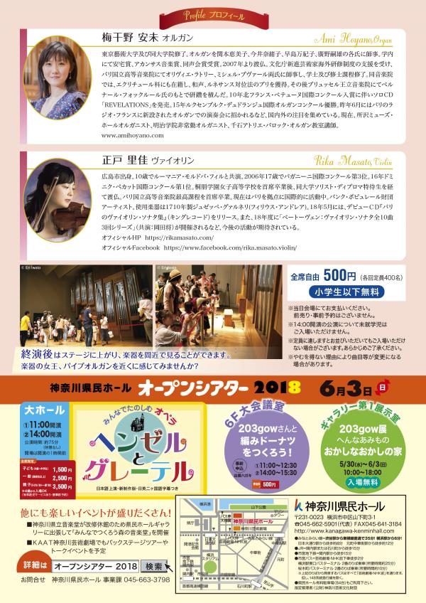 梅干野安未(オルガン) Ami Hoyano, Organ 正戸里佳(ヴァイオリン) Rika Masato, Violin【①11:00開演】0歳からご入場いただけます バッハ:フーガ ト短調 BWV578 バッハ:G線上のアリア ★ モーツァルト:キラキラ星変奏曲 より ★ フンパーディンク:夕べの祈り(オペラ「ヘンゼルとグレーテル」より) グノー:マリオネットの葬送行進曲 さんぽ(映画「となりのトトロ」より) ボエリー:幻想曲とフーガ 変ロ長調 モンティ:チャルダッシュ ★ 【②14:00開演】小学生からご入場いただけます バッハ:来ませ、聖霊、主なる神 BWV651 バッハ:前奏曲とフーガ ニ短調 BWV539 プーランク:平和のためにお祈りください ★ ボエリー:幻想曲とフーガ 変ロ長調 フンパーディンク:夕べの祈り(オペラ「ヘンゼルとグレーテル」より) ラインベルガー:主題と変奏(“ヴァイオリンとオルガンのための6つの作品”より) ★ グノー:マリオネットの葬送行進曲 モンティ:チャルダッシュ ★ ★はオルガンとヴァイオリン その他はオルガン・ソロ 各回約45分 + オルガン見学約15分梅干野安未(オルガン) Ami Hoyano, Organ 東京芸術大学及び同大学院修了。オルガンを関本恵美子、今井奈緒子、早島万紀子、廣野嗣雄の各氏に師事。学内にて安宅賞、アカンサス賞、同声会賞受賞。2007年より渡仏。文化庁新進芸術家海外研修制度の支援を受け、パリ国立高等音楽院にてオリヴィエ・ラトリー、ミシェル・ブヴァール両氏に師事し、学士及び修士課程修了。その後ブリュッセル王立音楽院にてベルナール・フォックルール氏のもとで研鑽を積んだ。10年北フランス・ベテューヌ国際コンクール入賞に伴いソロCD「REVELATIONS」を発売。15年ルクセンブルク・デュドランジュ国際オルガンコンクール優勝。現在、所沢ミューズ・ホールオルガニスト、明治学院非常勤オルガニスト、千石アトリエ・バロック・オルガン教室講師。 オフィシャルHP www.amihoyano.com 正戸里佳(ヴァイオリン) Rika Masato, Violin 広島市出身。10歳でルーマニア・モルドバ・フィルと共演。2006年パガニーニ国際コンクール第3位。16年ドミニク・ぺカット国際コンクール第1位および聴衆賞受賞。広島大学附属中学校卒業。桐朋学園女子高等学校を首席卒業後、同大学ソリスト・ディプロマ特待生を経て渡仏。パリ国立高等音楽院修士課程および最高課程を首席卒業後、ザルツブルク・モーツァルテウム音楽大学院を修了。現在はパリを拠点に精力的に演奏活動を行っている。バンク・ポピュレール財団アーティスト。使用楽器は1710年製ジュゼッペ・グァルネリ(フィリウス・アンドレア)。 オフィシャルHP https://rikamasato.com/ オフィシャルFacebook https://www.facebook.com/rika.masato.violin/