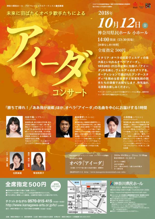 ソプラノ:内田千陽 テノール:岸浪愛学 バリトン:小林啓倫 ピアノ:石野真穂 構成・演出:菊池裕美子ヴェルディ:オペラ「アイーダ」より 勝ちて帰れ!(アイーダ) ああ我が故郷(アイーダ) まあお父様!(アイーダ/アモナズロ) 二人の上に平安が(ラダメス/アイーダ) ヴェルディ:オペラ「椿姫」より 燃える心を(アルフレード) ヴェルディ:オペラ「ドン・カルロ」より 終わりの日はきた(ロドリーゴ)内田千陽(ソプラノ) Chiharu Uchida 島根県出身。国立音楽大学卒業、同大学院修士課程(オペラ)修了。第61期 二期会オペラ研修所マスタークラス修了。修了時、優秀賞受賞。第53回日伊声楽コンコルソ第3位受賞。 2018年度、文化庁新進芸術家海外研修制度(短期)研修員。山内ゆかり、故 経種廉彦、澤畑恵美の各氏に師事。二期会会員 今回のオペラ「アイーダ」公演のアンダースタディを務める。 岸浪愛学(テノール) Aigaku Kishinami 東京都出身。中国政府全額奨学生として中国中央音楽学院の学士、修士課程を修了。新国立劇場オペラ研修所第16期修了。ミラノ・スカラ座にて海外研修プログラムを受講。中国の国家大劇院と上海大劇院に於いて小澤征爾音楽塾-サイトウキネンメモリアルコンサート「合唱幻想曲」テノール第二ソリスト、セイジ・オザワ松本フェスティバル『ジャンニ・スキッキ』リヌッチョ役等数多くの作品に出演。 小林啓倫(バリトン) Hiromichi Kobayashi 東京都出身。国立音楽大学卒業、同大学院修了。二期会オペラ研修所及び新国立劇場オペラ研修所修了。日伊声楽コンコルソ第2位。これまでに『フィガロの結婚』フィガロ/伯爵、『ドン・ジョヴァンニ』題名役、『魔笛』パパゲーノ等多くの作品に出演。また宗教曲等でもソリストを務める。二期会デビューとなった2017年『こうもり』ファルケに続き、本年9月『ジャンニ・スキッキ』ではマルコを演じた。二期会会員チケット
