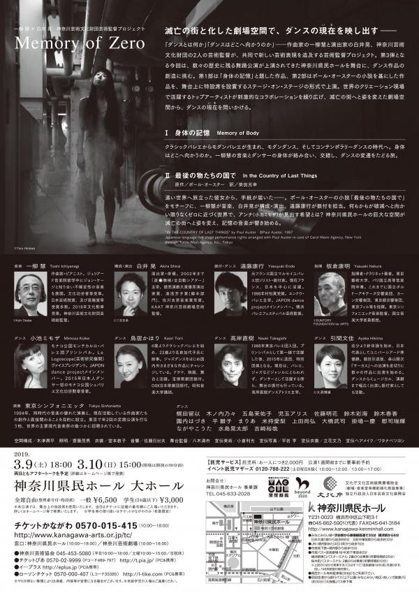■音楽監修・ピアノ/一柳 慧 ■構成・演出/白井 晃 ■振付/遠藤康行 ■指揮/板倉康明 ■演奏/東京シンフォニエッタ ■ダンス/ 小池ミモザ 鳥居かほり 高岸直樹 引間文佳 遠藤康行 梶田留以 木ノ内乃々 五島茉佑子 児玉アリス 佐藤明花 鈴木彩海 鈴木春香 平 雛子 まりあ 米持愛梨 上田尚弘 大橋武司 掛場一慶 郡司瑞輝 ながやこうた 水島晃太郎 吉﨑裕哉 ■空間構成/木津潤平 ■照明/齋藤茂男 ■衣裳/堂本教子 ■音響/佐藤日出夫 徳久礼子 ■映像/栗山聡之 ■ヘアメイク/谷口ユリエ ■舞台監督/八木清市 ■プロダクションマネージャー/堀内真人 ■宣伝美術/小倉利光 ■宣伝写真/平岩 亨 ■宣伝衣裳/立花文乃 ■宣伝ヘアメイク/ワタナベツヨシ ※出演者はやむを得ず変更になる場合があります。あらかじめご了承ください。第1部 身体の記憶 Memory of Body クラシックバレエからモダンバレエが生まれ、モダンダンス、そしてコンテンポラリーダンスの時代へ。身体はどこへ向かうのか。一柳慧の音楽とダンサーの身体が絡み合い、交錯し、ダンスの変遷をたどる旅。 第2部 最後の物たちの国で In the Country of Last Things (原作/ポール・オースター 訳/柴田元幸) 遠い世界へ旅立った彼女から、手紙が届いた――。ポール・オースターの小説「最後の物たちの国で」をモチーフに、一柳慧が音楽、白井晃が台本・演出、遠藤康行が振付を担当。何もかもが破滅へと向かい限りなくゼロに近づく世界で、アンナ(小池ミモザ)が見出す希望とは?神奈川県民ホールの巨大な空間が滅亡の街へと姿を変え、記憶の音楽が響き始める。 【曲目】 一柳慧:交響曲第8番 リヴェレーション2011 一柳慧:リカレンス 一柳慧:レゾナント・スペース 一柳慧:タイム・シークエンス ほか “IN THE COUNTRY OF LAST THINGS” by Paul Auster © Paul Auster, 1987 Japanese language live stage performance rights arranged with Paul Auster in care of Carol Mann Agency, New York through Tuttle-Mori Agency, Inc., Tokyo 一柳 慧 Toshi Ichiyanagi 作曲家・ピアニスト。ジュリアード音楽院留学中にジョン・ケージと知り合い不確定性の音楽を展開。これまでに文化功労者等受章。日本芸術院賞、及び恩賜賞等受賞多数。2018年秋、文化勲章受章。神奈川芸術文化財団芸術総監督。 白井 晃 Akira Shirai 演出家・俳優。2002 年まで「遊◎機械/全自動シアター」主宰。読売演劇大賞優秀演出家賞、湯浅芳子賞(脚本部門)、佐川吉男音楽賞受賞。KAAT 神奈川芸術劇場芸術監督。 遠藤康行 Yasuyuki Endo 元フランス国立マルセイユバレエ団ソリスト・振付家。現在フランス、日本を中心に活躍。1998 年村松賞受賞。エンドウ・バレエ主宰。JAPON dance projectメインメンバー。横浜バレエフェスティバル芸術監督。 板倉康明 Yasuaki Itakura 指揮者・クラリネット奏者。東京藝術大学、パリ国立高等音楽院卒業。これまでに国立ボルドーアキテーヌ交響楽団、カーン交響楽団、東京都交響楽団、東京フィルハーモニー等を指揮。東京シンフォニエッタ音楽監督。国立音楽大学客員教授。 小池ミモザ Mimoza Koike モナコ公国モンテカルロ・バレエ団プリンシパル。Le Logoscope(芸術研究機関)ヴァイスプレジデント。JAPON dance projectメインメンバー。2015 年日本人ダンサー初のモナコ公国シュバリエ文化功労勲章受章。 鳥居かほり Kaori Torii 4歳よりクラシックバレエを始め、22歳より名倉加代子氏に師事。ジャズダンスをはじめ国内外さまざまな作品にチャレンジしている。ドラマ、映画、舞台と活躍。宝塚歌劇団振付。OSK日本歌劇団振付。昭和音楽大学講師。 高岸直樹 Naoki Takagishi 1986年東京バレエ団入団。プリンシパルとして第一線で活躍した後、2015年に退団、特別団員となる。現在は、バレエ、ジャズなどジャンルにとらわれず、ダンサーとして活躍する傍ら、舞台の振付も行っている。高岸直樹ダンスアトリエ主宰。 引間文佳 Ayaka Hikima 幼少より新体操を始め、日本代表としてユニバーシアード準優勝。競技引退後、森山開次『サーカス』への出演を皮切りに数々の作品に出演を始める。ダンスからミュージカル、演劇公演まで幅広く出演する中、振付家としても活動。 東京シンフォニエッタ Tokyo Sinfonietta 1994年、同時代の音楽の優れた演奏と、現在活動している作曲家たちの創作と直接関わることを目的に設立。東京で年2回の定期公演を行なう他、世界の主要現代音楽祭の幾つかに招聘されている。 ※詳細なプロフィールと全出演ダンサーのプロフィールは特設サイトよりご覧いただけます。スケジュール