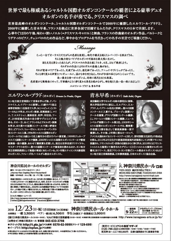 世界最高峰のオルガンコンクール、シャルトル国際オルガンコンクールで2000年に優勝したエルワン・ル・プラドと、2008年に優勝した青木早希。フランスを拠点に世界各国で活躍するふたりが、クリスマスの日本で共演します。心華やぐ12月の午後、味わい深いノエル(=クリスマス・キャロル)と舞曲、フランスの作曲家のオルガン作品、バルトークとリゲティのピアノ、チェンバロのための作品など、華やかなプログラムを当代きっての名手の至芸でご堪能ください。
