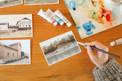 写真のポストカードを印刷し、油絵具を使って色付けをします。160年前にタイムスリップ