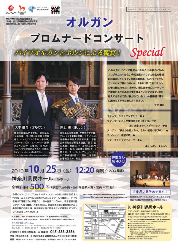 大平 健介(オルガン) Kensuke Ohira, Organ 岸上 穣(ホルン) Jo Kishigami, HornC.サン=サーンス:アンダンテ ◆★ C.サン=サーンス:交響曲第3番「オルガン付き」第1楽章 より<アダージョ> ◆★ O.メシアン:「峡谷から星たちへ」より<恒星の呼び声> ★ K.ヨハンセン:希望の歌 ◆ G.リテーズ:トリプティーク ◆★ ◆オルガン ★ホルン大平 健介(オルガン)Kensuke Ohira, Organ 神奈川県横浜市生まれ。東京藝術大学オルガン専攻卒業、同大学院修士課程修了。DAAD(ドイツ学術交流会)給費留学生として2010年秋より渡独。ヴュルツブルク音楽大学オルガン科マイスター課程、及び同大学教会音楽科を卒業。平成25年度文化庁新進芸術家海外研修員。10-15年、ヴュルツブルクバッハカンタータクラブ音楽監督。16-17年、 シュトゥットガルト-ボトナングにてカントールを務めた他、ソリテュード宮殿礼拝堂におけるコンサートシリーズの音楽監督も兼任。18年よりシュティフツ教会オルガニストに就任。16年、IONニュルンベルク国際オルガンコンクール優勝。同年夏よりドイツを拠点にヨーロッパを巡るコンサートツアーを開始。ソリストとしてはこれまでに聖母教会 (ドレスデン)、ミュンスター(フライブルク)、 コンツェルトハウス(ベルリン)、聖ジェームズ聖堂(プラハ)、聖ポール大聖堂(ロンドン)等から招待を受けている。ドイツ・シュトゥットガルト在住。 https://kensuke-ohira-com.webnode.com/ 岸上 穣(ホルン)Jo Kishigami 4歳よりヤマハ音楽教室にてピアノと作曲を、12歳よりホルンを始め、京都市立音楽高校(現:京都市立京都堀川音楽高校)を経て、東京藝術大学を安宅賞ならびにアカンサス音楽賞を受賞し卒業。フランクフルト音楽舞台芸術大学を首席で卒業。京都芸術祭毎日新聞社賞受賞。第23回日本管打楽器コンクール第1位。第74回日本音楽コンクール入選、第80回同コンクール第2位。ソリストとして東京シティ・フィルハーモニック管弦楽団(指揮:梅田俊明)、藝大フィルハーモニア(指揮:広上淳一)、レ・シエクル(指揮:フランソワ=クサヴィエ・ロト)、東京都交響楽団(指揮:梅田俊明・船橋洋介)、愛知室内オーケストラ(指揮:新田ユリ)など国内外のオーケストラと共演。小澤征爾音楽塾Ⅶ・Ⅷ、東京のオペラの森、ラ・フォル・ジュルネ「熱狂の日」音楽祭、アフィニス夏の音楽祭、サイトウキネンフェスティバル、プラハの春国際音楽祭、第46回国際ホルンシンポジウム(イギリス)、光州国際音楽祭(韓国)、なにわ《オーケストラル》ウィンズ、Wiesbaden Symphonic Brassに参加。バンドジャーナル誌にてワンポイントレッスンを連載。これまでにホルンを冨成裕一、小山亮、森陽子、守山光三、西條貴人、E.タパニ、C-F.ダルマンの各氏に師事。Travel Brass Quintet、Brass Ensemble ZERO、つの笛集団、東京シンフォニエッタ、Quintetto Ariabella、The Horn Quartet各メンバー。デトモルト国立歌劇場研修生、ヴィースバーデン・ヘッセン州立歌劇場契約団員を経て、2009年東京都交響楽団に入団。現在は国内外のオーケストラへの客演や室内楽、ソロをはじめ、CM音楽や映画・ドラマのサントラ録音などのスタジオミュージシャンや、ナチュラルホルンを使用しての活動も行なっている。19年冬、ドイツのレーベルOrganum社よりCDをリリース予定。 使用楽器:Alexander103MBL ナチュラルホルン:Andreas Jungwirth(Lausmann) Twitter:@jokorikiチケット