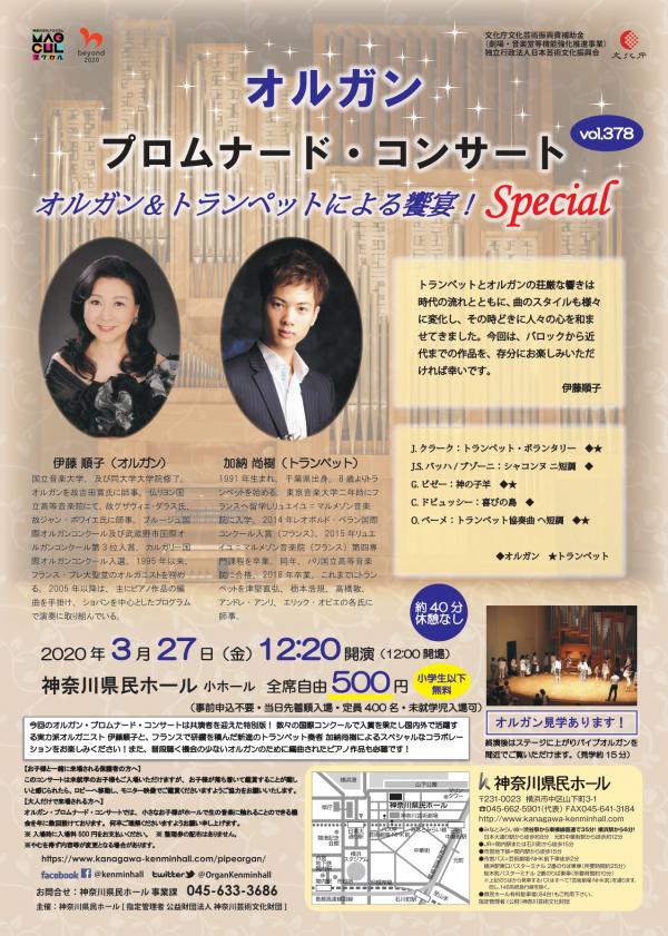 神奈川県民ホールにて開催を予定しておりました、2020年3月27日(金)オルガン・プロムナード・コンサート スペシャルは、新型コロナウイルスの感染拡大防止に係る神奈川県及び文化庁からの要請を受け、やむなく中止することといたしました。