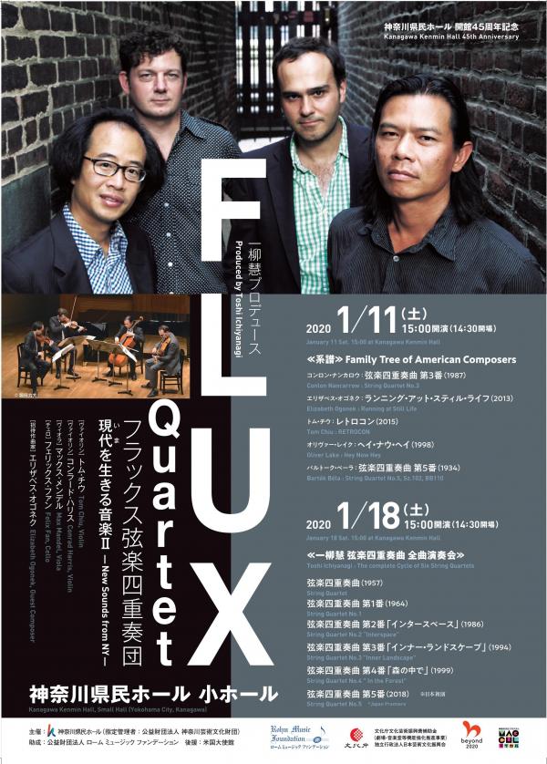 神奈川県民ホールでは一柳慧(作曲家、ピアニスト、神奈川芸術文化財団芸術総監督)プロデュースによる室内楽公演を継続しておおくりしてきました。今回は2015年に初来日しナンカロウ、アダムズ、カーター、一柳、黛など日米の多彩な現代音楽で鮮烈な日本デビューを果たしたフラックス弦楽四重奏団が再来日し、彼らのオリジナルプログラムと一柳慧弦楽四重奏曲全曲演奏会、この2本のコンサートを柱に、公開リハーサル、ワークインプログレス、シンポジウムなど、現代音楽三昧の企画をお届けします。また彼らと縁が深くシカゴ響、ロンドン響などから引く手数多の新鋭作曲家・エリザベス・オゴネクが初来日し企画に参加いたします。既存の弦楽四重奏団とはまったく違った視点から「刺激的」で「カッコいい」現代音楽を体現する彼らの圧倒的パフォーマンスをお見逃しなく!