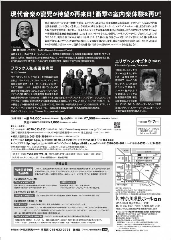 ヴァイオリン:トム・チウ Tom Chiu, Violin ヴァイオリン:コンラード・ハリス Conrad Harris, Violin ヴィオラ:マックス・メンデル Max Mandel, Viola チェロ:フェリックス・ファン Felix Fan, Cello 招待作曲家:エリザベス・オゴネク Elizabeth Ogonek, Guest Composerコンロン・ナンカロウ:弦楽四重奏曲 第3番(1987) Conlon Nancarrow : String Quartet No.3 エリザベス・オゴネク:ランニング・アット・スティル・ライフ(2013) Elizabeth Ogonek : Running at Still Life トム・チウ:レトロコン(2015) Tom Chiu : RETROCON オリヴァー・レイク:ヘイ・ナウ・ヘイ(1998) Oliver Lake : Hey Now Hey バルトーク・ベーラ:弦楽四重奏曲 第5番(1934) Bartók Béla : String Quartet No.5, Sz.102, BB110フラックス弦楽四重奏団 FLUX Quartet 「現代音楽においてもっとも注目すべきアンサンブルのひとつである」 ― ジョシュア・コスマン:サンフランシスコ・クロニクル ― 「弦楽四重奏の音楽シーンに新風をもたらした」 ― カイル・ガン:ヴィレッジ・ヴォイス ― ヴァイオリンのトム・チウにより1998年に結成された。オーストラリア、ヨーロッパ、アメリカの国際音楽祭や、カーネギーホール、ケネディセンターなどで演奏し、いずれも絶賛を博している。CD録音も積極的に行っており、とくにモートン・フェルドマンの6時間にも及ぶ弦楽四重奏曲第2番の全曲録音(Mode Records)は特筆すべき功績である。ケージ、フェルドマン、リゲティ、ナンカロウやクセナキスなど20世紀後半を代表する作曲家の作品を演奏し、マイケル・バイロン、ジュリオ・エストラーダ、一柳慧などの新作初演を100以上行っている。2015年、神奈川県民ホールでの初来日公演、17年、エスパス ルイ・ヴィトン東京でのフェルドマン「弦楽四重奏曲第2番」はいずれも大きな注目を集めた。 公式ウェブサイト:http://www.fluxquartet.com/ エリザベス・オゴネク(作曲家) Elizabeth Ogonek, Composer 1989年、ミネソタ州アノーカ生まれ。ギルドホール音楽院博士課程修了。彼女の作品はクサヴィエ・ロト指揮ロンドン交響楽団、ムーティ指揮シカゴ交響楽団、フラックス弦楽四重奏団等、著名な演奏家によって演奏されている。2018-19シーズンのシカゴ交響楽団レジデントコンポーザー。現在、オーバリン大学で客員准教授を務めている。 一柳 慧(作曲家・ピアニスト) Toshi Ichiyanagi, Composer / Pianist 神戸生まれ。19歳で渡米、ジョン・ケージと偶然性や図形楽譜による音楽活動を展開。尾高賞、フランス芸術文化勲章、毎日芸術賞、京都音楽賞大賞、サントリー音楽賞、日本芸術院賞及び恩賜賞等受賞多数。2008年より文化功労者、18年には文化勲章を受章。神奈川芸術文化財団芸術総監督。チケット
