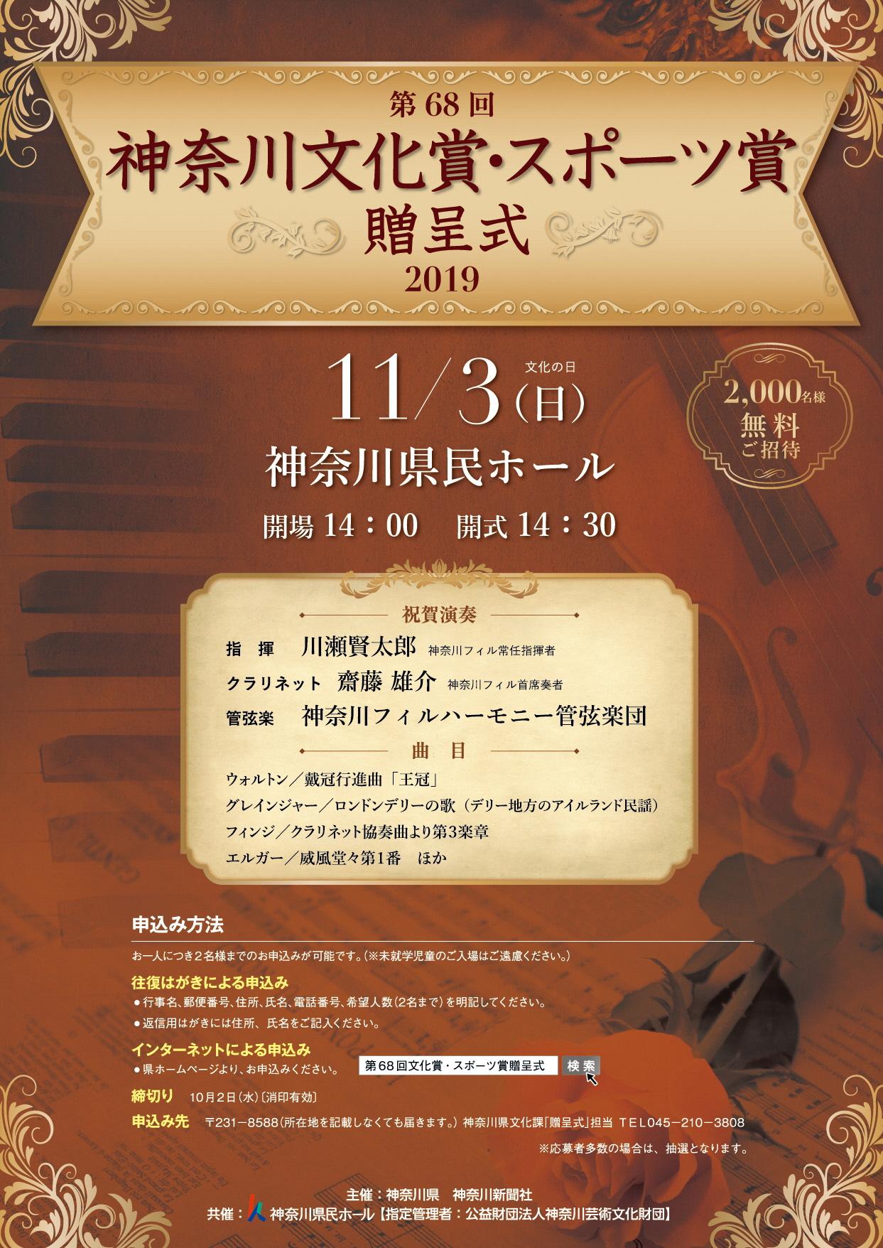 「文化の日」の11月3日に神奈川県民ホール(横浜市中区山下町)で開催する、神奈川文化賞・スポーツ賞贈呈式と神奈川フィルハーモニー管弦楽団による祝賀演奏に2,000名様を無料でご招待します。
