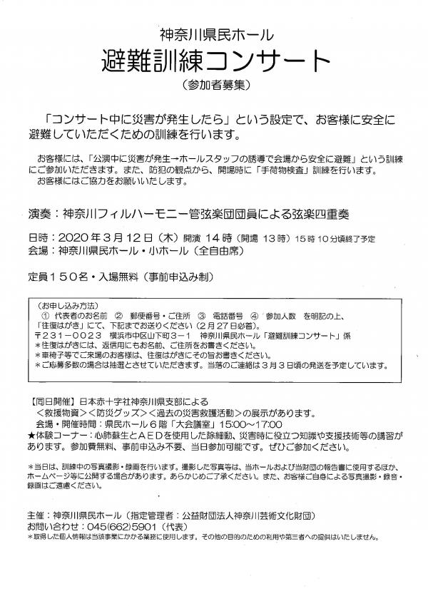 〒231-0023 横浜市中区山下町3-1 神奈川県民ホール「避難訓練コンサート」係