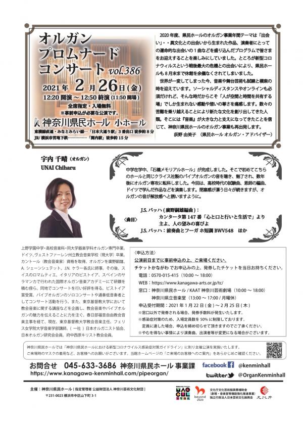 宇内 千晴(オルガン) UNAI Chiharu, OrganJ.S.バッハ/廣野嗣雄編曲:カンタータ第147番「心と口と行いと生活で」より 主よ、人の望みの喜びよ J.S.バッハ:前奏曲とフーガ ホ短調 BWV548 ほか上野学園中学・高校音楽科・同大学器楽学科オルガン専門卒業。ドイツ、ヴェストファーレン州立教会音楽学校(現大学)卒業。カントール(教会音楽家)資格を取得。オルガンを廣野嗣雄、A.シェーンシュテット、J.N.ケラー各氏に師事。その後、スイスのロマムティエ、イタリアのピストイア、スペインのサラマンカで行われた国際オルガン音楽アカデミーにて研鑚を積む傍ら、同地でコンサートを行い好評を得る。ピストイア賞受賞。パイプオルガンのソロコンサートや通奏低音奏者としてコンサート活動を行う。また、東京基督教大学において「教会音楽アカデミー公開講座」「パイプオルガンさん こんにちは」などを企画し、教会音楽やパイプオルガンの魅力を伝えることに力を注ぐ。春日部福音自由教会音楽主事を経て、現在、東京基督教大学教会音楽主任、フェリス女学院大学音楽学部講師。(一社)日本オルガニスト協会、日本オルガン研究会会員。府中西原キリスト教会会員。