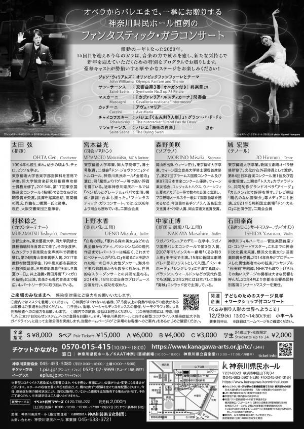 指揮:太田弦 司会・バリトン:宮本益光 ソプラノ:森野美咲 カウンターテナー:村松稔之 テノール:城宏憲 バレエ:上野水香(東京バレエ団)/中家正博(新国立劇場バレエ団) コンサートマスター・ヴァイオリン:石田泰尚 ピアノ:中島剛 オルガン:荻野由美子(神奈川県民ホール オルガン・アドバイザー) 管弦楽:神奈川フィルハーモニー管弦楽団ジョン・ウィリアムズ:オリンピックファンファーレとテーマ サン=サーンス:交響曲第3番「オルガン付き」終楽章より マスカーニ:『カヴァレリア・ルスティカーナ』間奏曲 カッチーニ:アヴェ・マリア チャイコフスキー:バレエ『くるみ割り人形』より グラン・パ・ド・ドゥ サン=サーンス:バレエ「瀕死の白鳥」 石田泰尚スペシャルセッション:ピアソラより ほか