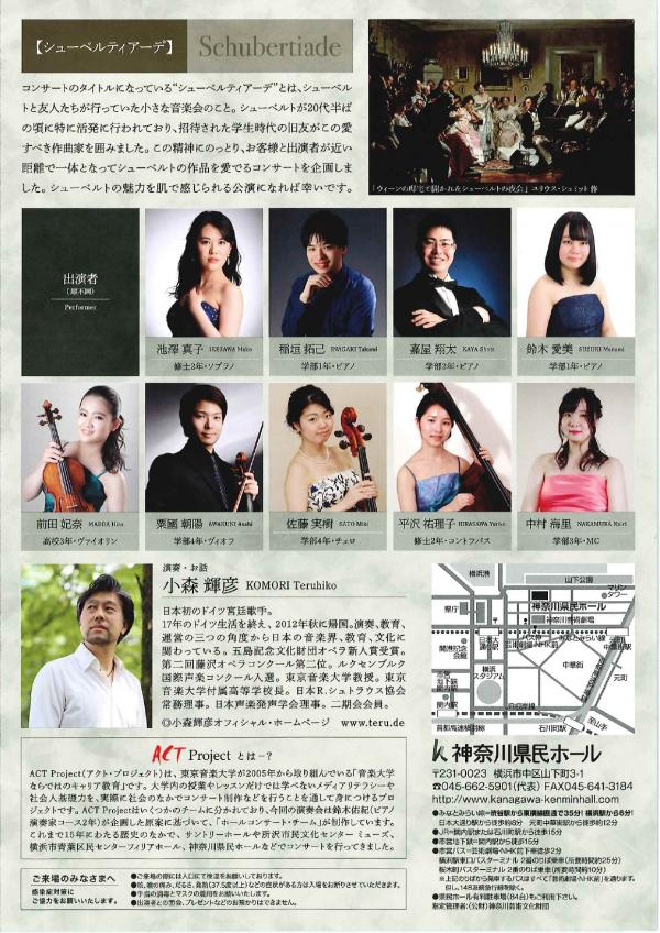 小森 輝彦(東京音楽大学教授) 池澤 真子、稲垣 拓己、嘉屋 翔太、鈴木 愛美、前田 妃奈、粟國 朝陽、佐藤 実樹、平沢 裕理子、中村 海里F.シューベルト:糸を紡ぐグレートヒェン D118 魔王 D328 鱒 D550 ピアノ五重奏曲イ長調「鱒」第4楽章 D667 即興曲 D899 冬の旅 D911(抜粋) ほかスケジュール