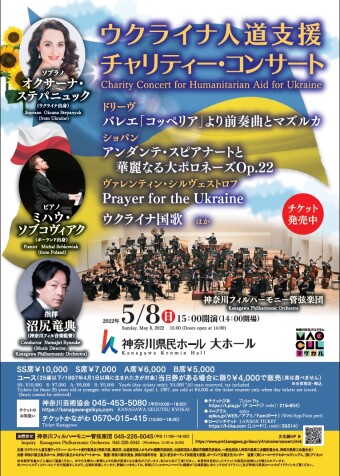 ウクライナ人道支援のため、神奈川フィルハーモニー管弦楽団の演奏によるチャリティー・コンサートを開催します。ウクライナから多くの避難民を受け入れているポーランドの駐日大使館及びポーランド広報文化センターの御協力を得て、ウクライナ及びポーランド出身のソリストに御出演いただきます。チケット代は、全てウクライナ避難民等に対する人道支援のために寄附しますので、是非、チケットをお求めのうえ、ご来場ください。