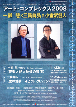 財団法人神奈川芸術文化財団芸術総監督・一柳慧の監修により2007年から開始されたパフォーマンス・シリーズ「アート・コンプレックス」。異なった分野の旬なアーティスト同士が交流し、刺激に満ちたアートシーンが鮮やかに表出し好評を得ているシリーズで、今回の「アート・コンプレックス2008」では、作曲家の一柳慧と三輪眞弘によるプロデュースが実現します。