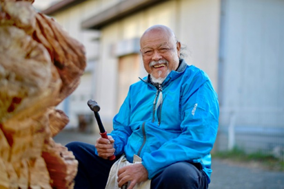 流木の力強い形に魅せられ、その秘めたエネルギーと対話するようにダイナミックな彫刻を制作。