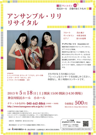 Ensemble Liri (アンサンブル・リリ) 若山桃子(フルート) 中澤沙央里(ヴァイオリン) 佐々木絵理(ピアノ) E.エルガー:愛の挨拶 J.S.バッハ:トリオソナタ第1番 F.クライスラー:愛の喜び M.ラヴェル:亡き王女のためのパヴァーヌ BEGIN:涙そうそう J.シュトラウスⅡ:「こうもり」より 序曲 G.プッチーニ:「トゥーランドット」より 誰も寝てはならぬ G.ビゼー:「カルメン」より 抜粋 J.マスネ:タイスの瞑想曲 A.F.ドップラー:「夢遊病の女」の主題によるパラフレーズ 桐朋学園大学出身のフルート、ヴァイオリン、ピアノの3人で結成。関東を中心に様々なシーンで演奏している。昨年4月のスプリングコンサート、12月に行なったクリスマスコンサートでは、共に満員御礼、好評を博す。クラシックだけでなく、ジャズ、ポップスから現代音楽まで、幅広いレパートリーを持ち、自由なスタイルで演奏する。